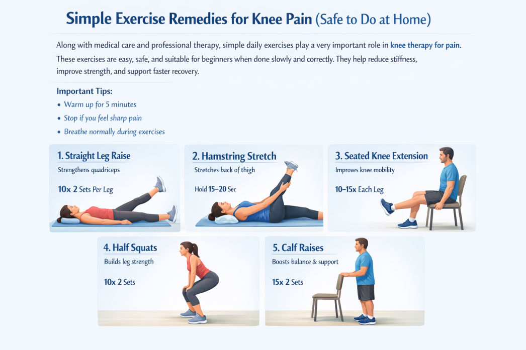 Along with medical care and professional therapy, simple daily exercises play a very important role in knee therapy for pain. These exercises are easy, safe, and suitable for beginners when done slowly and correctly. They help reduce stiffness, improve strength, and support faster recovery.